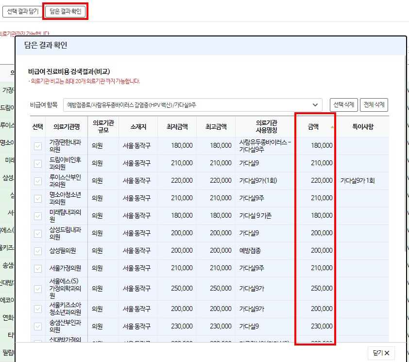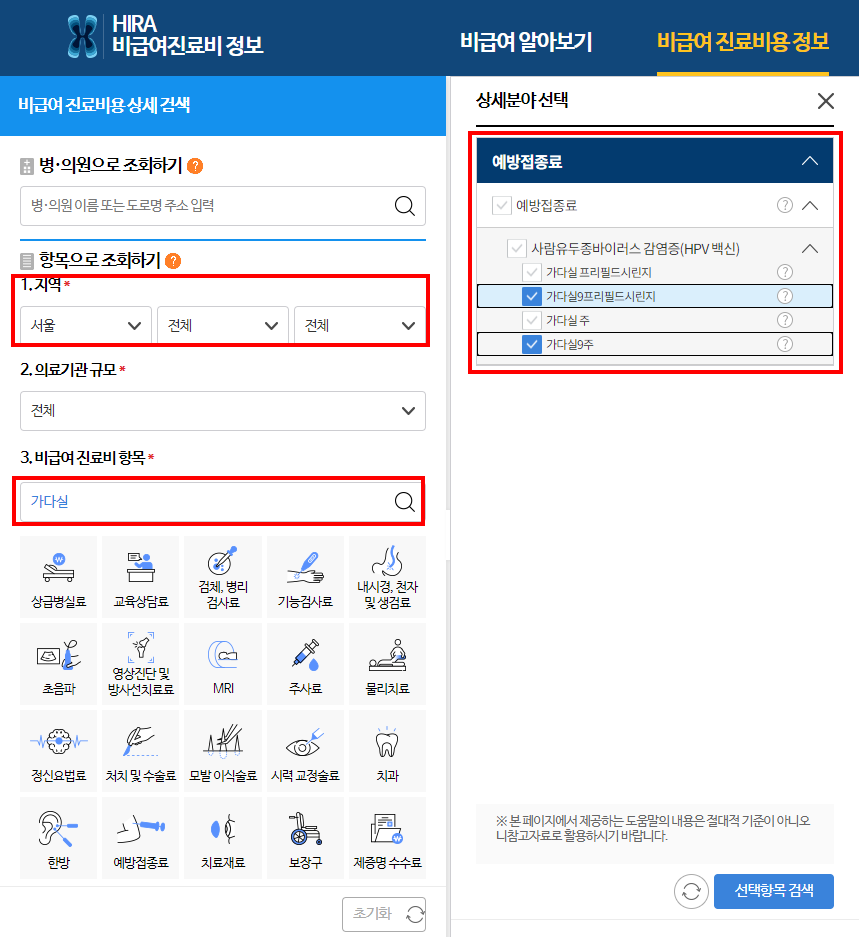 원하는 지역 / '가다실' 검색 > 가다실 종류 체크 후 > 선택항목 검색 > 체크박스 클릭해서 선택 결과 담기 > 담은 결과 확인 하여 금액 확인 가능