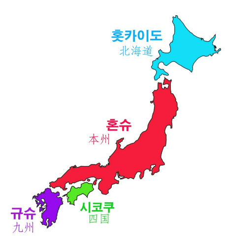 이 섬들은 북쪽부터 홋카이도, 혼슈, 시코쿠, 규슈로 구분됩니다. 일본은 동쪽으로 태평양, 서쪽으로는 동중국해와 인접해있다.