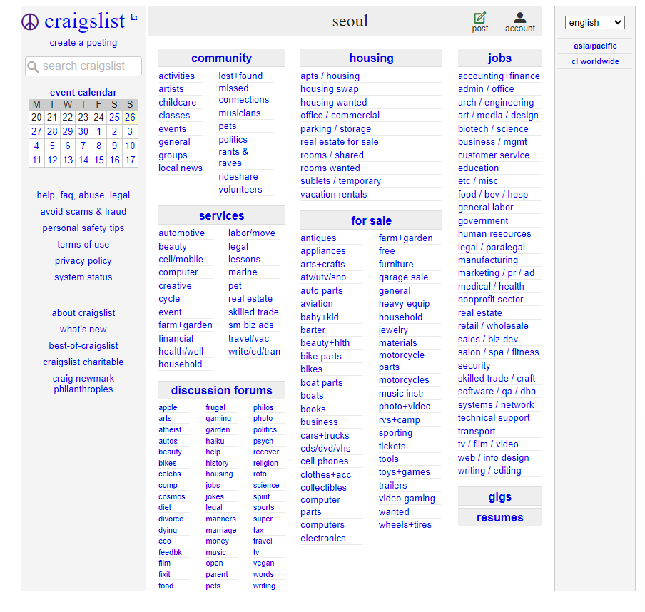 각 나라마다 활발하게 운영되는 사이트 크레이그리스트 craigslist
