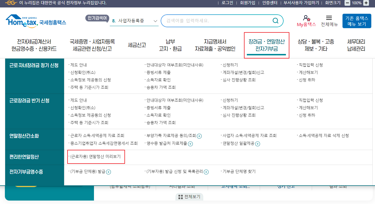 국세청 홈택스 > 장려금.연말정산 전자기부금 > [연말정산 미리보기] 서비스 이용