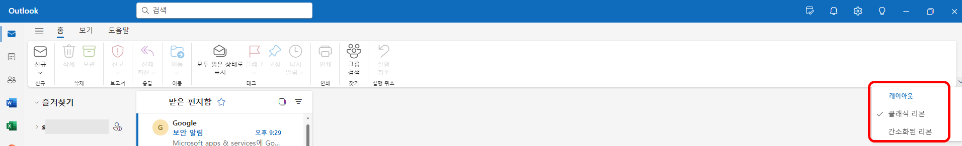 3) 우측 아래화살표 클릭하여 레이아웃 /클래식 리본/간소화된 리본 설정 가능!