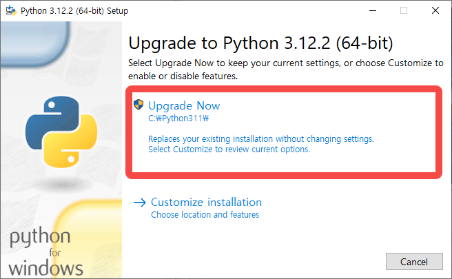 저는 한번 설치를 했었기 때문에 Upgrade Now 라고 뜨네요.