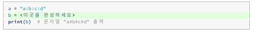 | 답 >>>a = "a:b:c:d" >>>b = a.replace(":","#") >>>print(b) a#b#c#d |