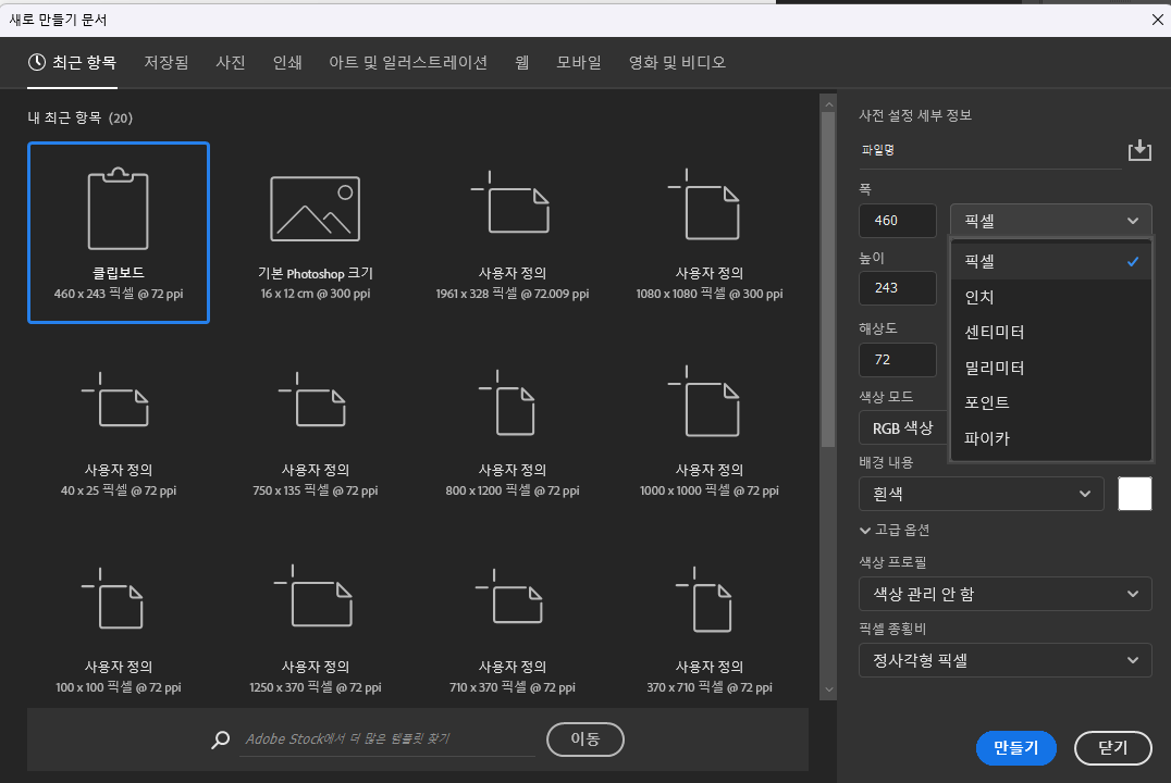 ㄴ 웹용 이미지 작업은 보통 '픽셀'단위를 사용합니다