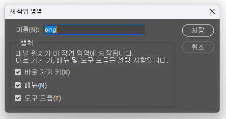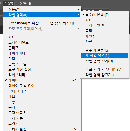 창(W) > 작업 영역 > 새 작업 영역 으로 나만의 세팅값을 저장해보아요