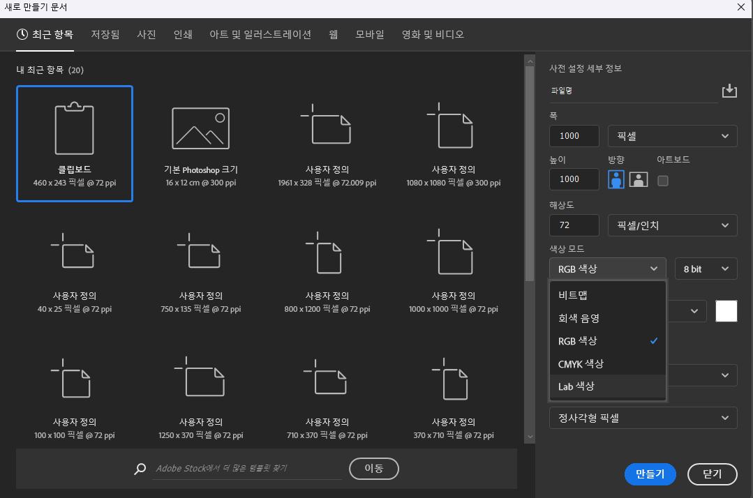 만들기 (Create) 또는 파일>새로만들기(New)