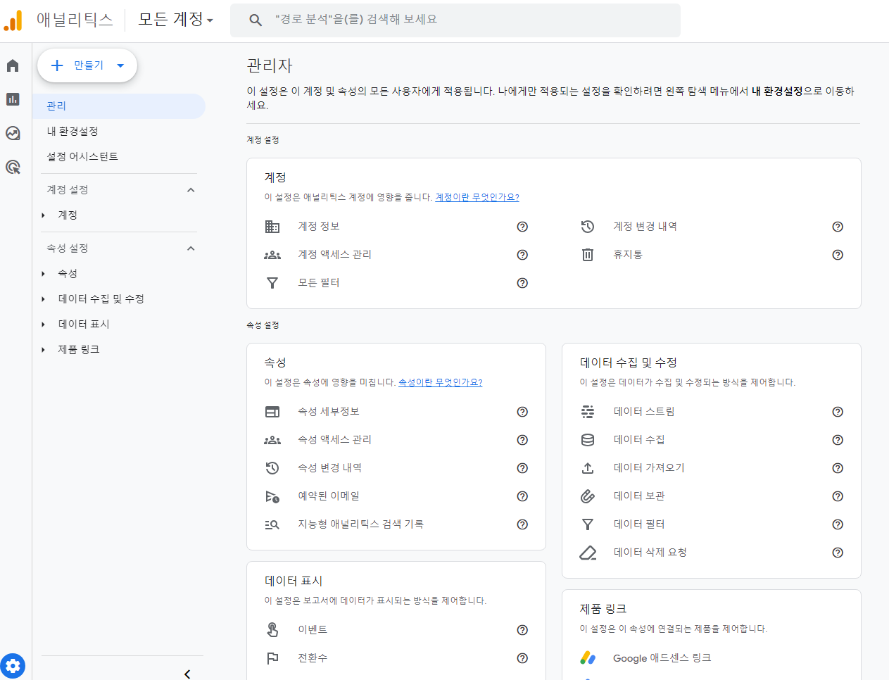 간단한 절차를 끝내면 이렇게 구글 애널리틱스 페이지로 도착합니다.