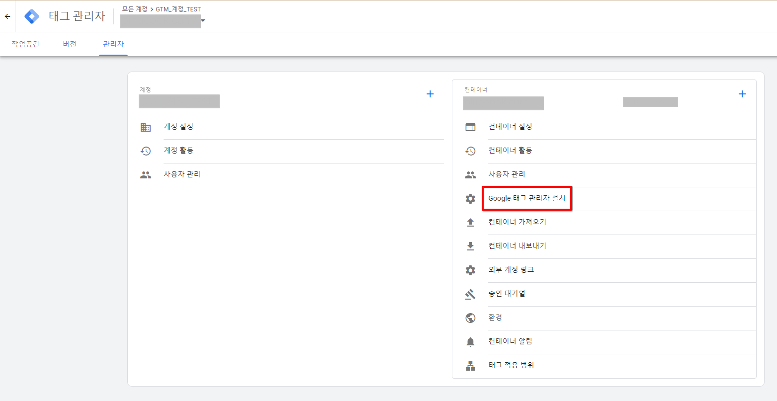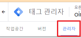 좌측 상단 [관리자] 클릭 > [Google 태그 관리자 설치] 클릭