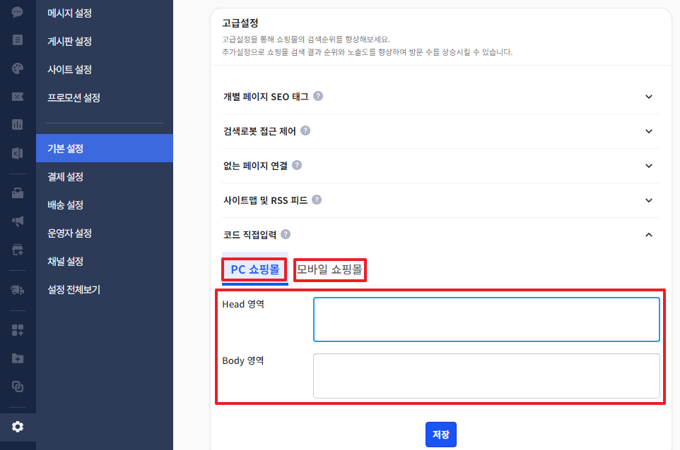 카페24 쇼핑몰 어드민 > [쇼핑몰 설정] > [기본 설정] > [검색 엔진 최적화(SEO)] > 고급 설정 하단 [코드 직접입력]