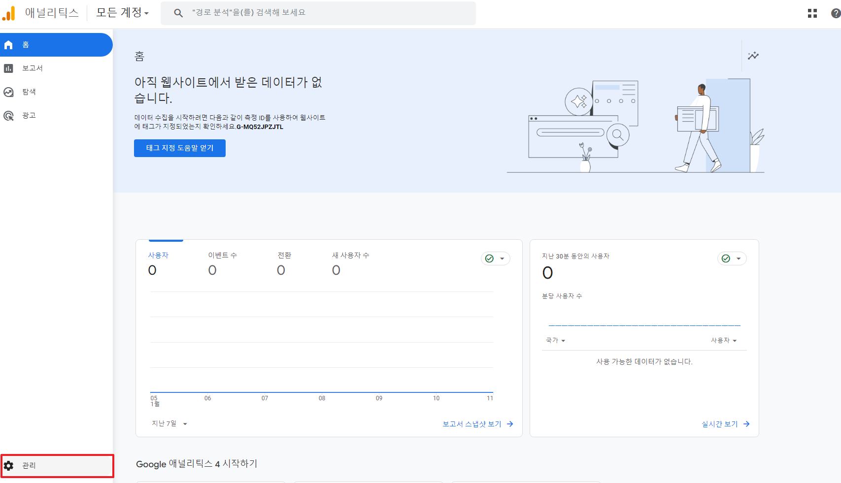 간단한 절차를 끝내면 이렇게 구글 애널리틱스 페이지로 도착합니다.