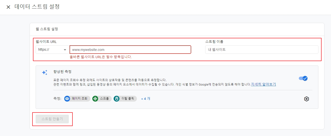 자신의 웹사이트 URL과 이름을 설정하고 '스트림 만들기' 버튼을 클릭해 주세요.
