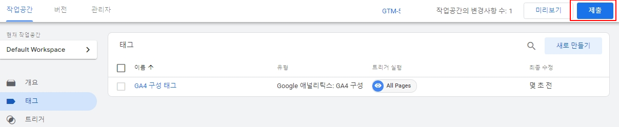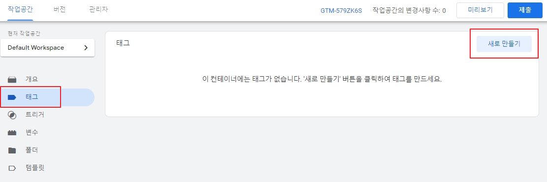 확인 버튼을 누르면 태그매니저 홈이 뜨는데, 왼쪽에서 '태그' 메뉴를 클릭하여 GA4 태그를 구성해 줍니다. '새로 만들기'를 클릭합니다.