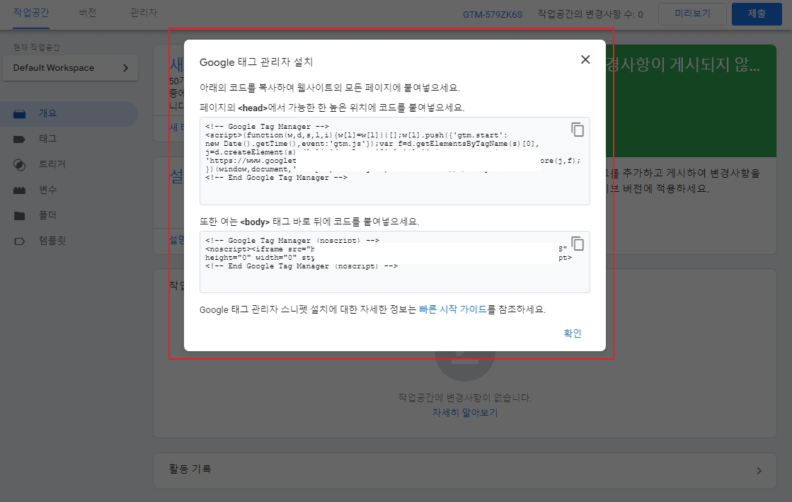 다음과 같이 'Google 태그 관리자 설치' 팝업창이 뜨면서 태그관리자 설치 코드가 나옵니다.