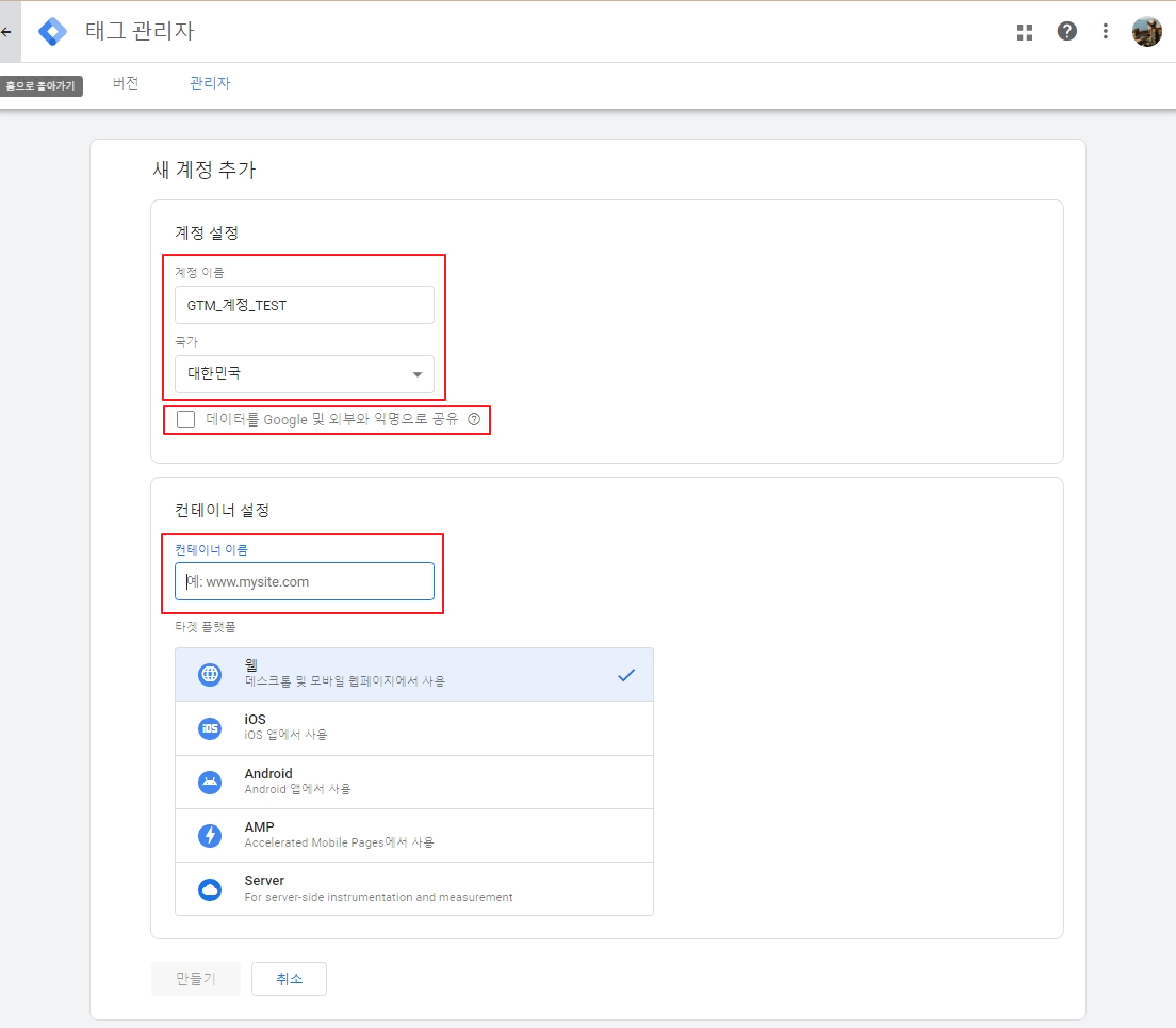태그 관리자가 처음이면, 계정부터 생성해야 합니다. '계정 만들기' 클릭 후, 계정이름, 국가:대한민국을 설정해 줍니다.