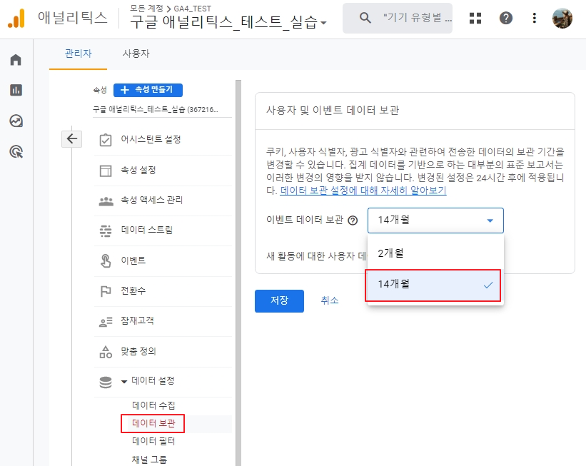기본값인 2개월을 14개월로 데이터 보관기간을 최대로 설정해 줍니다.