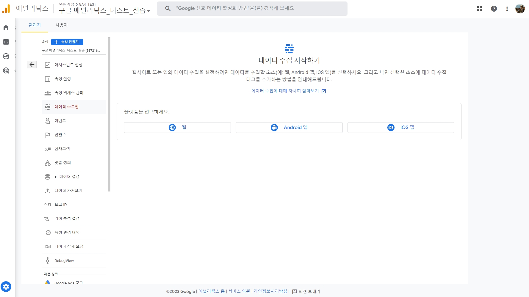 웹 / Android앱 / ios 앱 플랫폼 버튼이 등장하는데, 이것들은 '데이터 스트림' 탭에 있습니다. 데이터 스트림은 웹/앱 데이터가 구글 애널리틱스로 흘러간다(stream)는 것을 의미합니다.