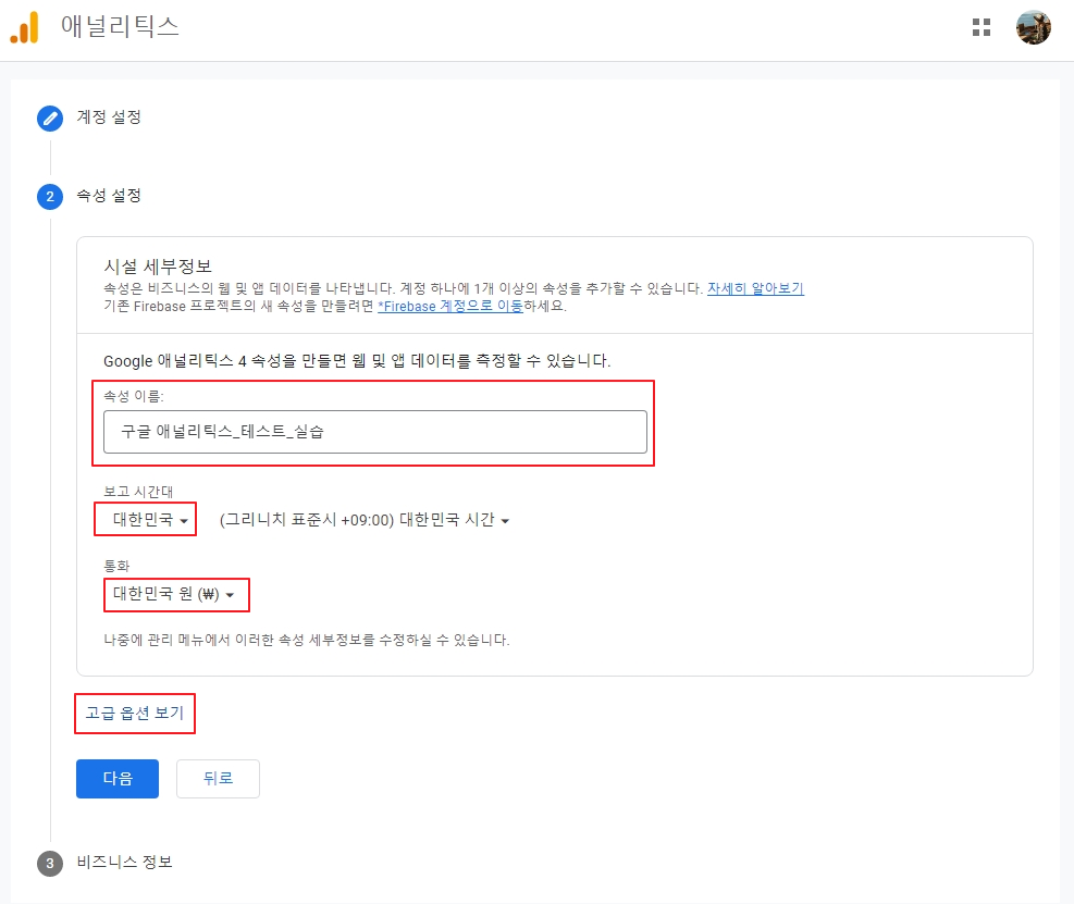 3. 속성 설정에서 속성 이름을 입력하고 보고 시간대를 '대한민국'으로 설정해 줍니다. 통화도 '대한민국 원'으로 설정합니다.
