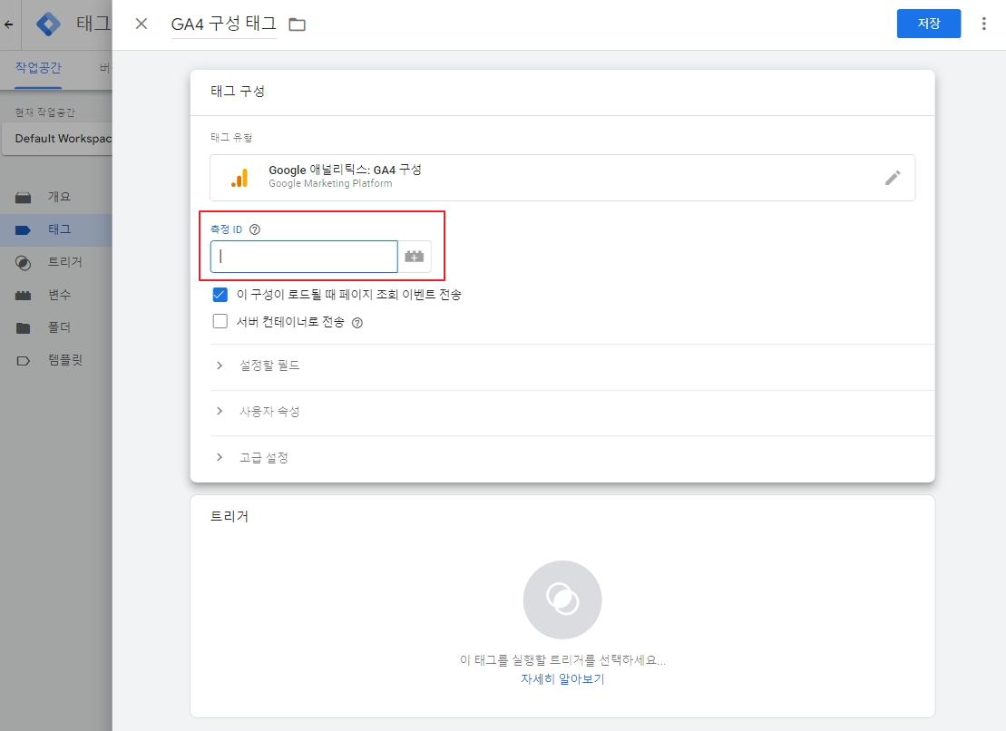 아까 GA4 스트림 세부정보에서 확인한 측정 ID (위에서 복사해 둔 측정 ID)를 입력합니다.