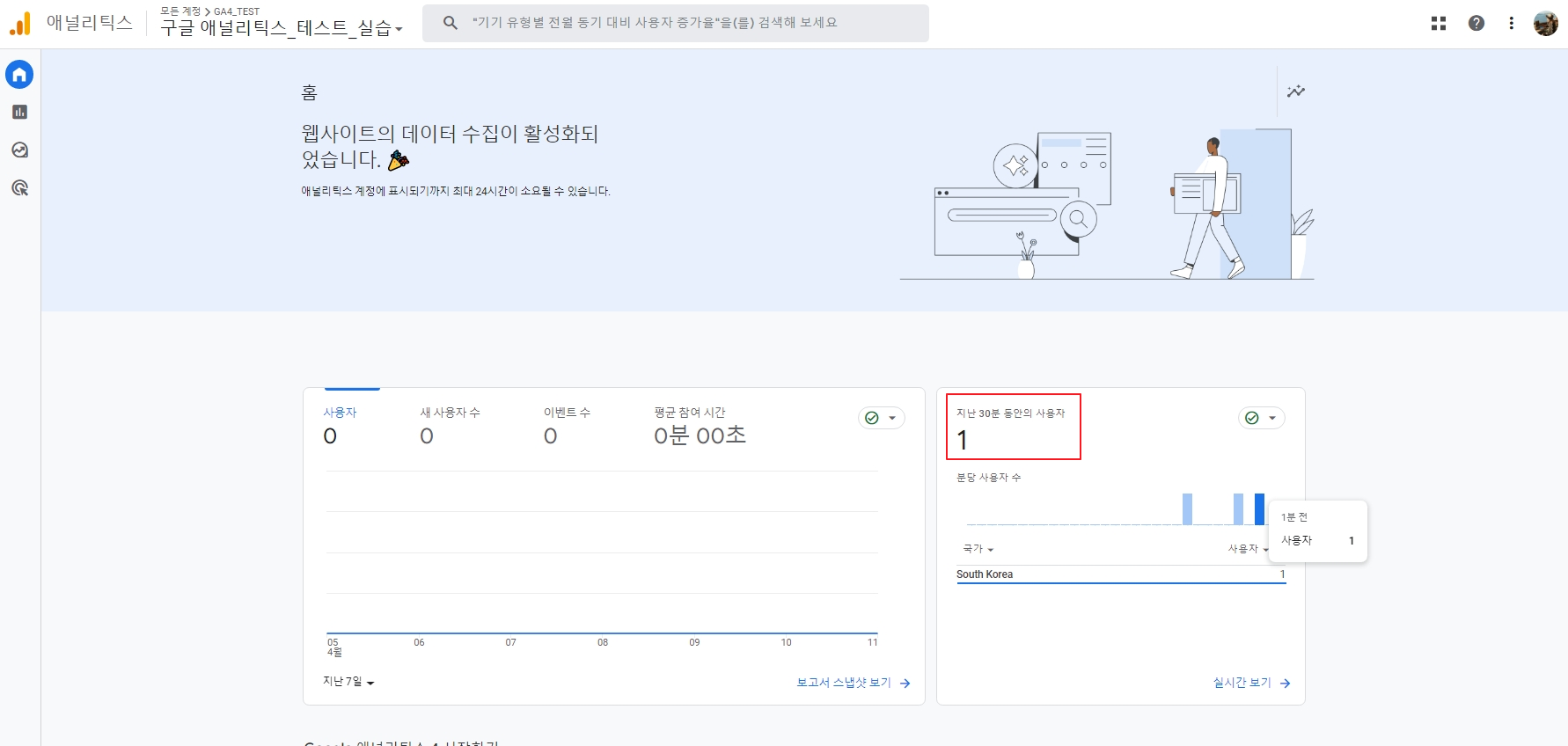 다시 구글애널리틱스로 들어가서 태그가 잘 설치되었는지 확인 가능합니다.