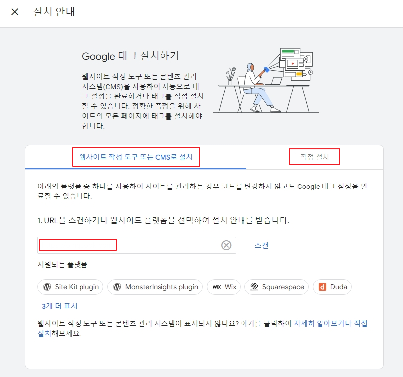 다음과 같이 'Google 태그 설치하기'로 설치 안내가 뜨면서 2가지 옵션이 등장합니다.