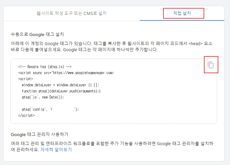 전체 사이트 태그를 삽입할 것이기 때문에, '직접 설치'를 클릭하면 이렇게 구글 태그를 확인할 수 있습니다.