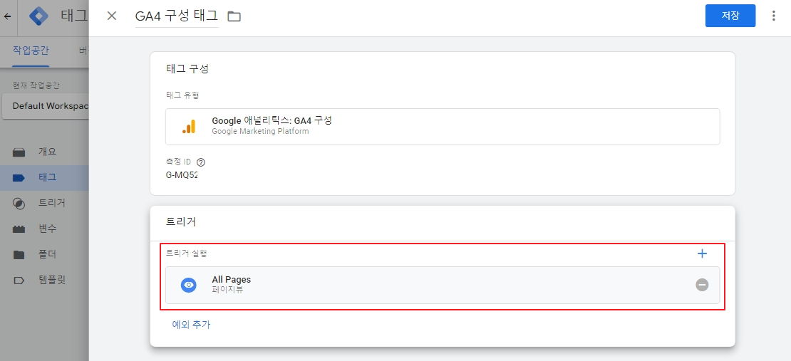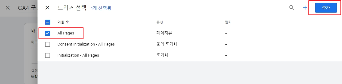 그 아래 '트리거'를 클릭하여 이 태그가 언제 작동할지 선택합니다. 저는 모든 페이지에서 읽힐 수 있도록 All Page로 선택했습니다. '추가' 버튼을 눌러주세요